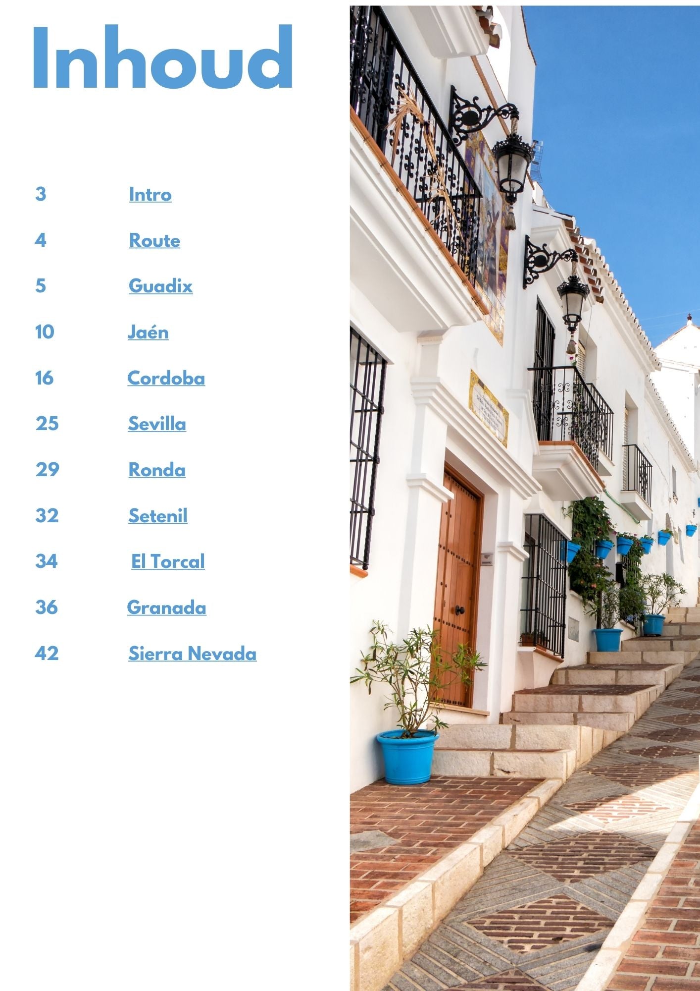Deze rondreis Andalusië neemt je mee langs de mooiste steden in het Zuiden van Spanje. Van grote steden als Cordoba & Sevilla tot aan kleine stadjes als Setenil de las Bodegas en Carmona. Via de directe route in Google Maps navigeer je makkelijk van plaats naar plaats. En de links in de gids geven je toegang tot websites vol achtergrondinformatie!