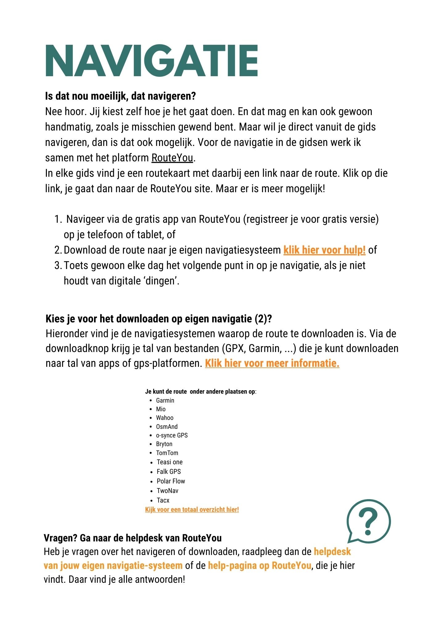 - of download de route op je eigen navigatiesysteem. Geschikt voor o.a: Garmin, Mio, Wahoo, OsmAnd, o-synce GPS, Bryton, TomTom, Teasi One, Falk GPS, Polar Flow, TwoNav, Tacx. Voor meer info kijk op de RouteYou-pagina.